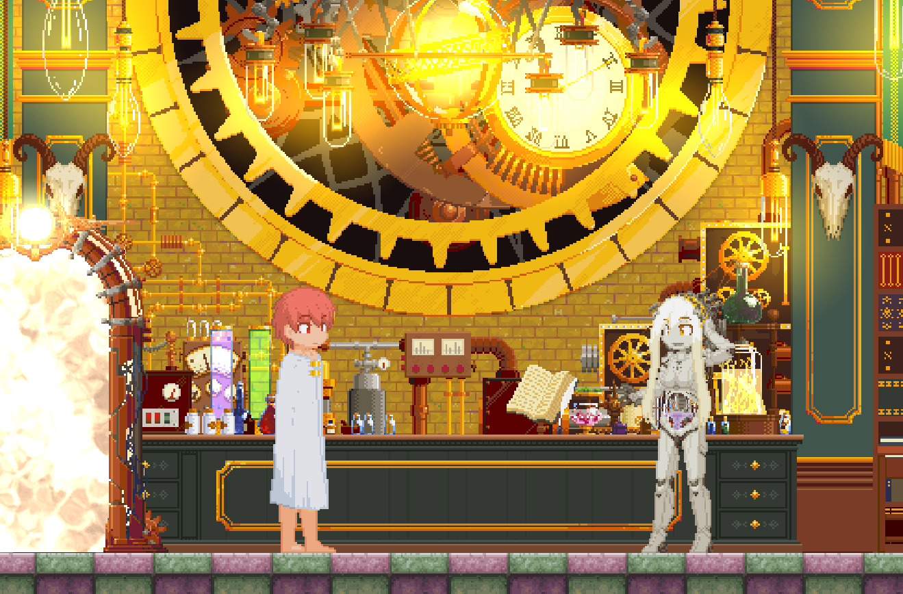 氛围与画面可谓本作最长的长板,第二关氛围已经很优秀了,然后第三关又能超越第二关,塑造了一个相当华丽的蒸汽朋克实验室,这点很好,当然这也离不开作者优秀的选曲,游戏的bgm很耐听。